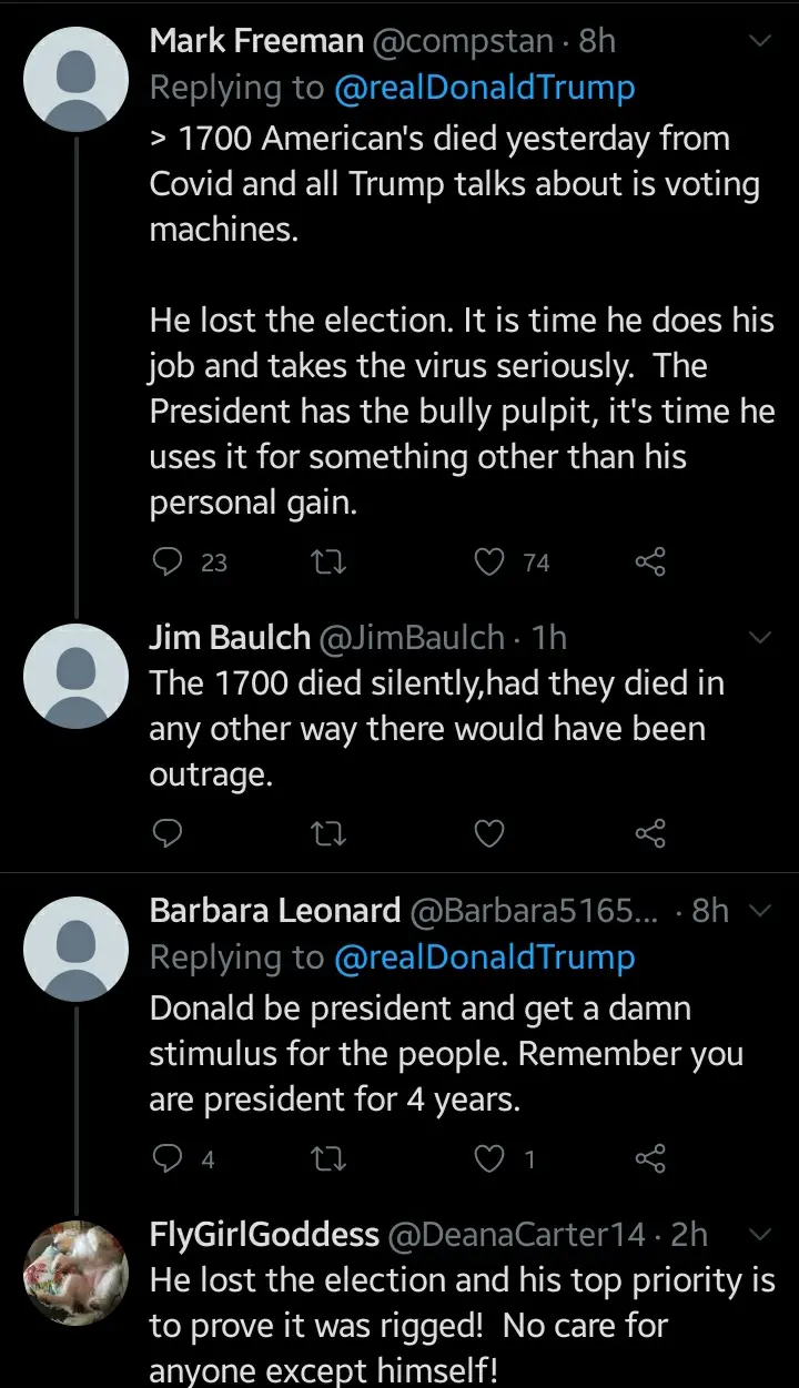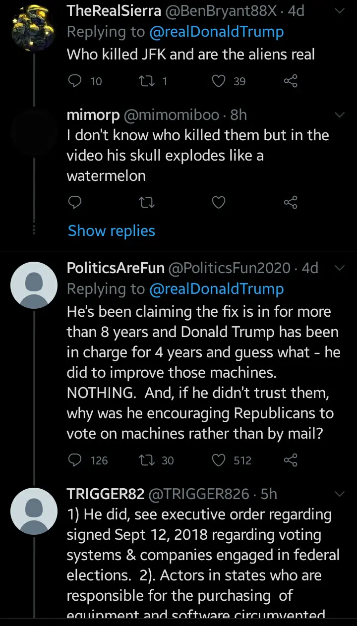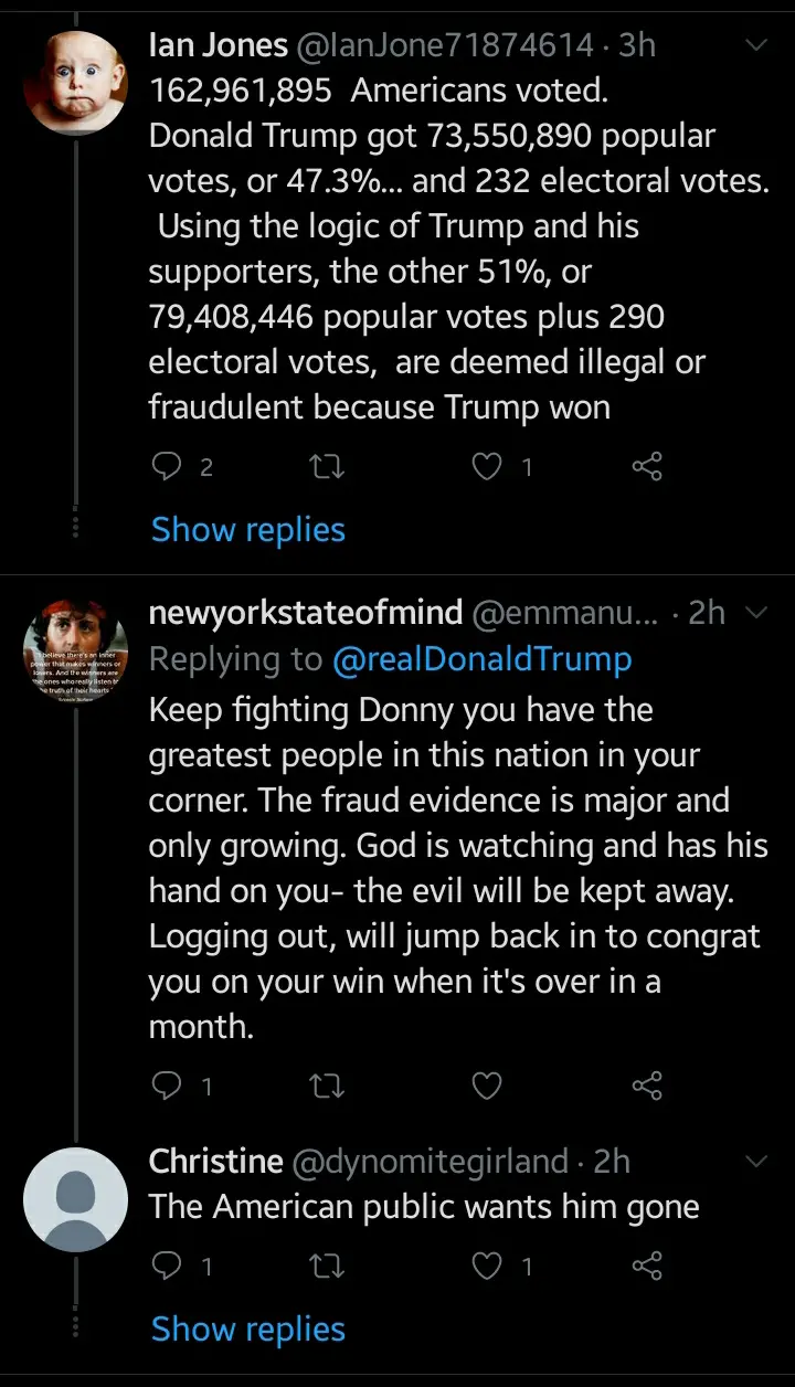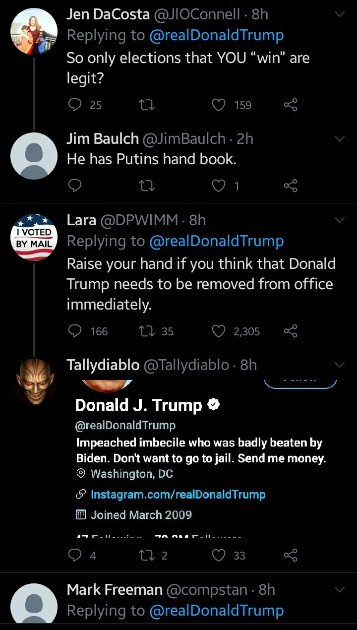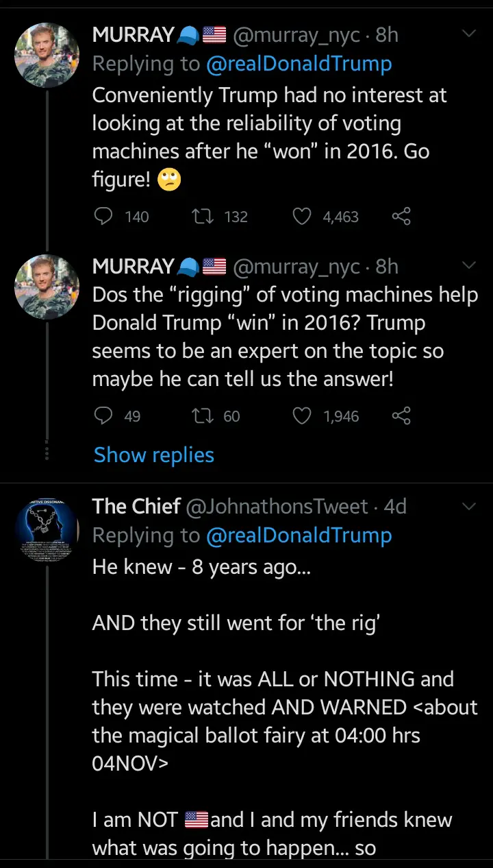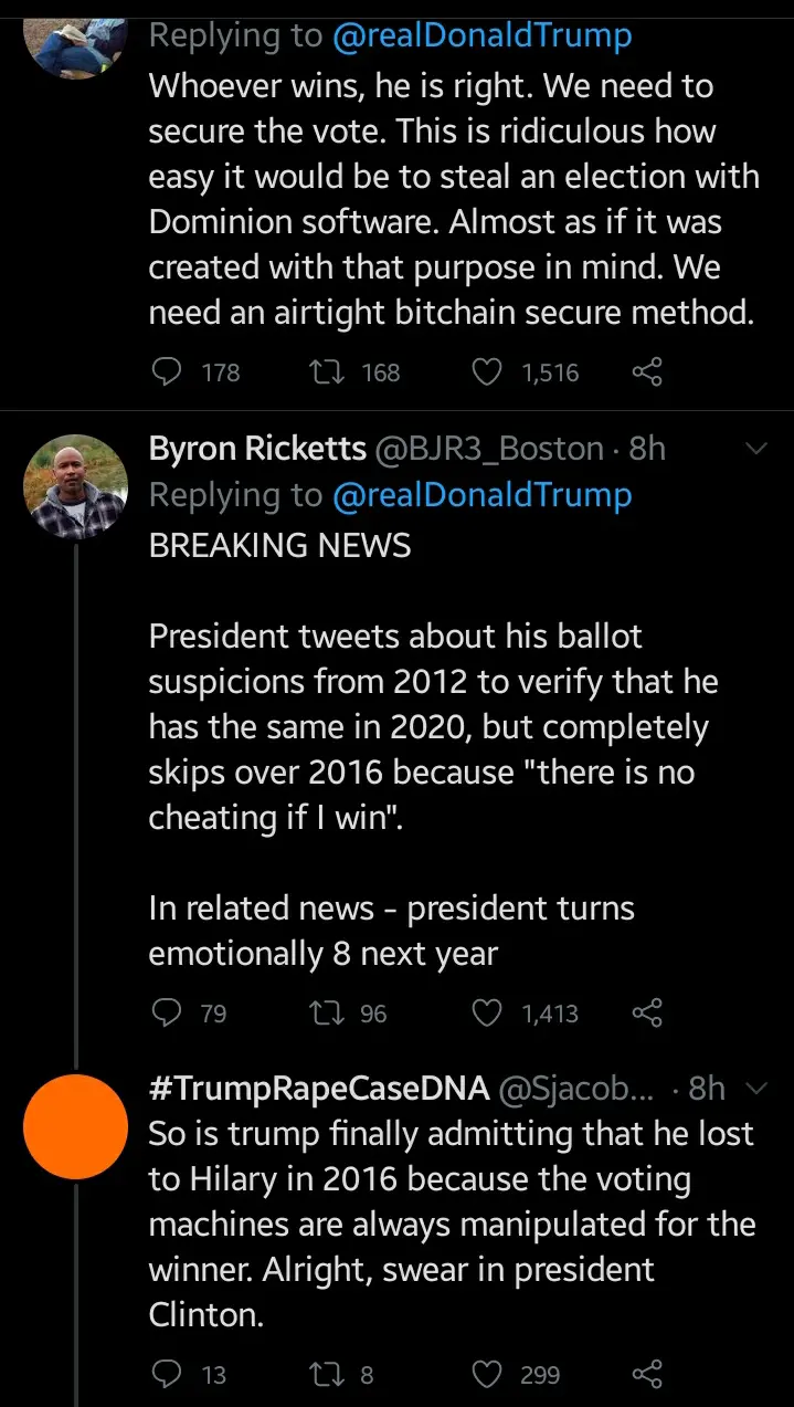 An American in a reply to Donald Trump's tweet categorically said "Trump tweet about Ballot Suspicions from 2012 to verify that he has the same in 2020 but completely left 2016 because there is no cheating if he wins".