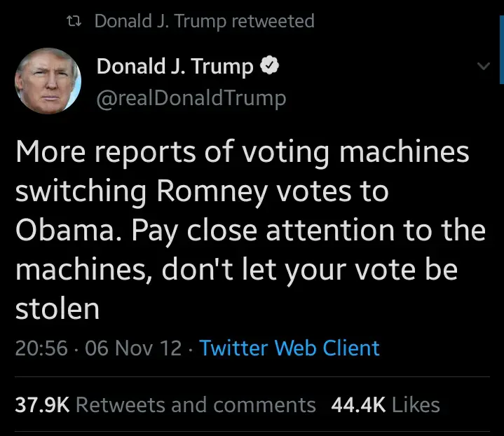 In 2012, Donald Trump tweeted that voting machines were switching Romney vote for Obama. A tweet Donald Trump retweeted this 2020 to certify his claim of alleged irregularities.